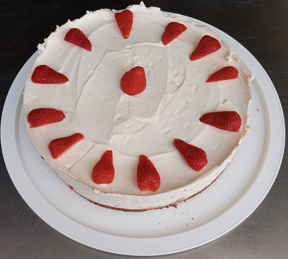 Kalup obložiti papirom za pečenje; na dno staviti biskvit, premazati kremom, na kremu utisnuti jagode. Tako slagati redom dok se sastojci potroše. Zadnji sloj tanko namazati kremom i poravnati.